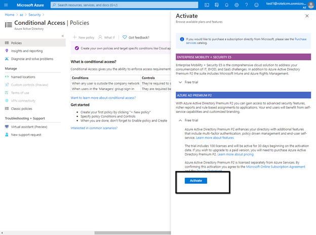 Conditional Access needs an Enterprise Mobility + Security E5 or Azure AD Premium P2 license. Activate any of them.
