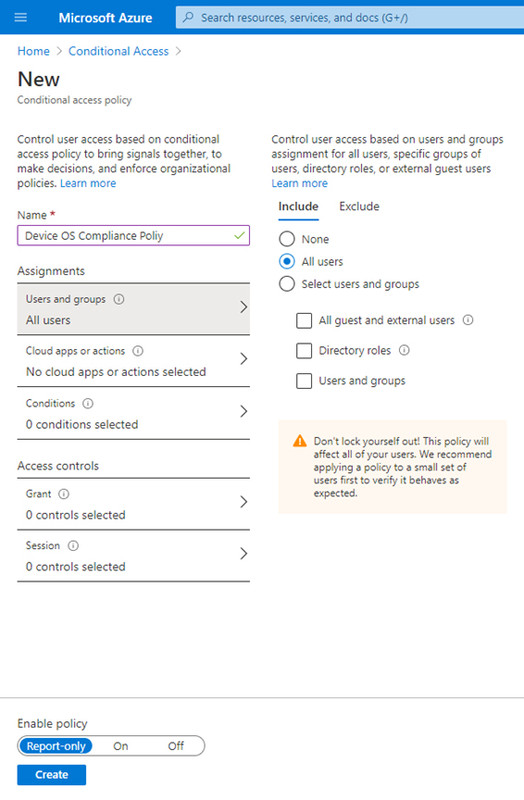 Users and groups, select Include All Users as we will applying the policy to all the users.