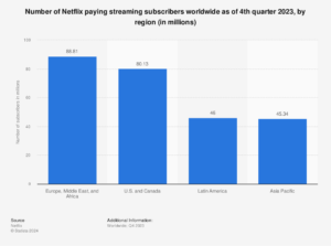 As of Q1 2023, Netflix has more than 77.32 million subscribers globally. At the same time, the platform had more than 74 million subscribers across Canada and the US. In the 2022 first quarter, its largest global market is North America. The platform has moved from sending DVDs mainly to distributing and producing Hollywood-level movies.