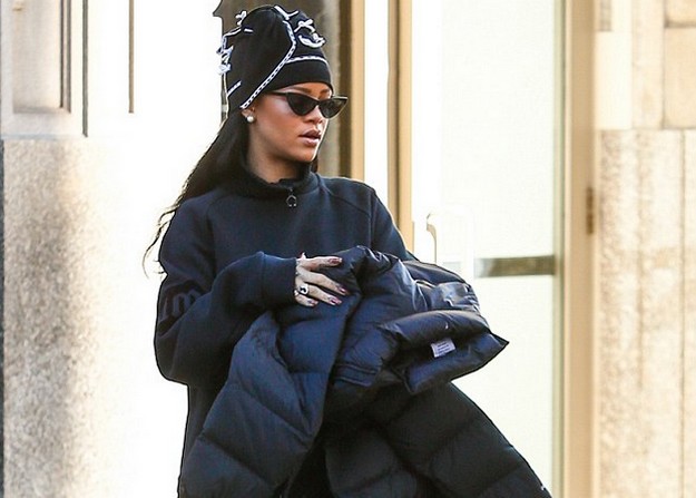 On her fingers were many rings. She was also wearing dark nail polish. A soft and puffy umbrella was also held in an arm. A knitted hat covered her black locks that were styled straight. There was only a little hint of make-up – a pink lipstick and some blush on the cheeks. Rihanna will perform in Quebec and Montreal in the coming days.